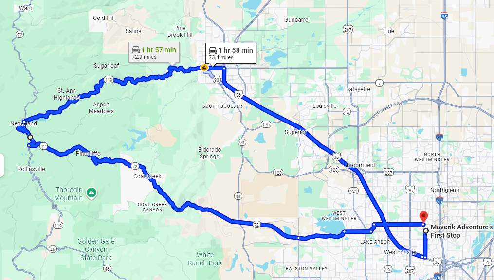Route: up Boulder Canyon (opposite rush-hour traffic), down Coal-Creek Canyon.