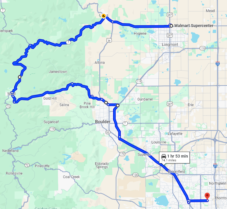 Route: west from Longmont up Hwy 7, south on Peak-to-Peak Hwy, down Left-Hand Canyon, Lee Hill Road, a pleasant route through Boulder, to Hwy 36 and to 5280 Eats (West Room, 1762 W 92nd Ave #5305, Denver, CO 80260). Note: it is verified that it is legal for us to ride in the Express Lane to minimize the traffic we deal with on Hwy 36 (the last leg).